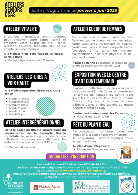 Les inscriptions sont obligatoires. Elles se font les lundi 9 et mardi 10 décembre 2024 de 9h à 12h auprès du CCAS soit par téléphone au 04.92.43.77.31 ou par e-mail sandrine.garcin.ccas@ville-embrun.fr.