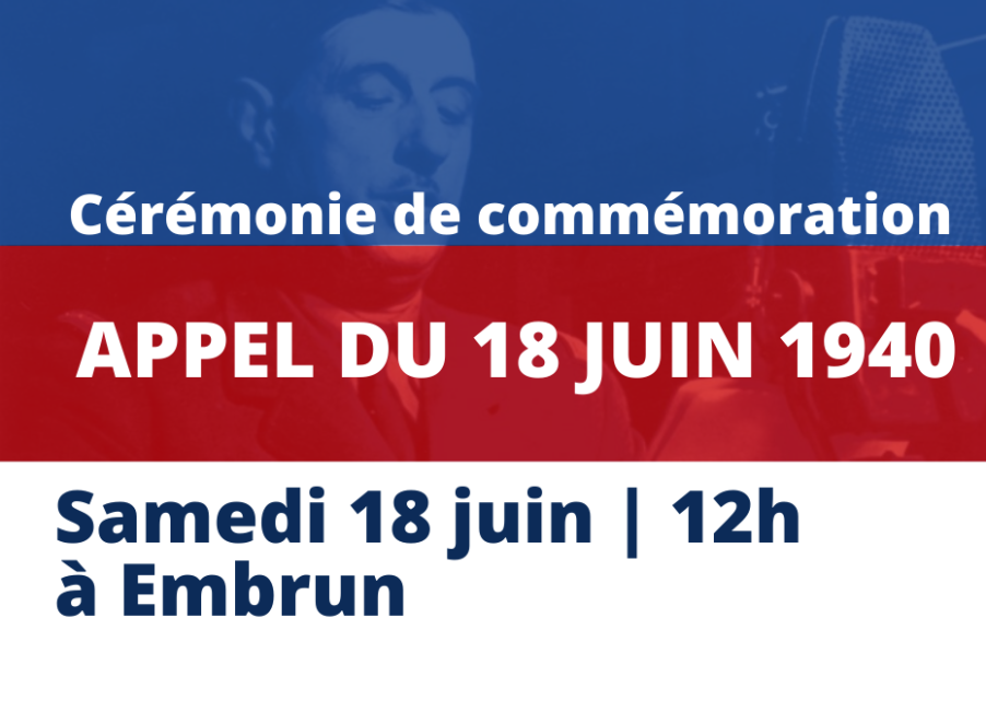 Chantal EYMEOUD, maire d'Embrun a le plaisir de vous inviter à la Cérémonie de commémoration de l'APPEL DU 18 JUIN 1940 qui se déroulera dans notre ville d'Embrun: