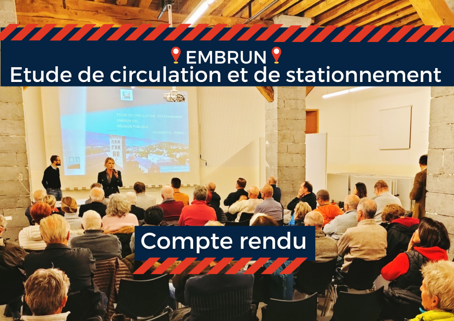 La Ville d'Embrun poursuit ses efforts pour améliorer les déplacements sur la commune. Iris Conseil, bureau d’études spécialisé dans l’ingénierie de transports et des déplacements de personnes, est mandaté par la municipalité pour réaliser une étude de circulation et de stationnement à Embrun. A l’issue de la première phase de diagnostic, Chantal EYMEOUD maire d'Embrun a organisé une réunion publique qui s'est tenue jeudi 1er décembre 2022 à la Manutention pour vous présenter les premiers constats.
