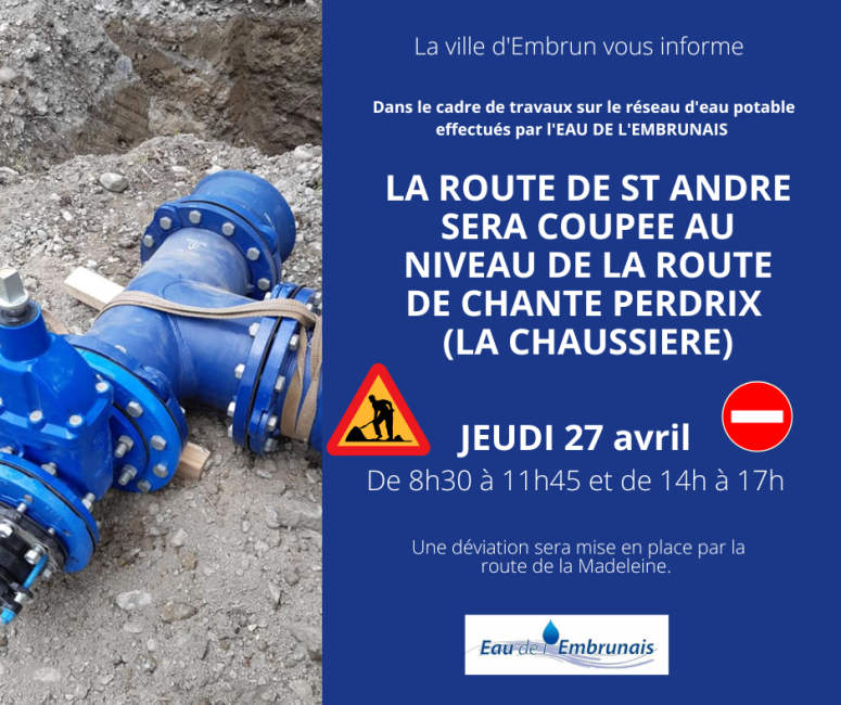 Nous vous informons qu'en raison de travaux réalisés sur le réseau d'eau potable par l'Eau de l'Embrunais