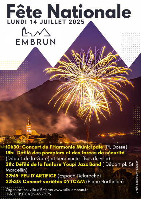 La Ville d’Embrun vous invite à célébrer la Fête Nationale avec un programme festif et familial le lundi 14 juillet 2025. Plusieurs temps forts viendront rythmer cette journée placée sous le signe de la musique, du partage et de la convivialité.