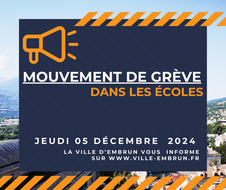 Pour les enfants dont l’enseignant est gréviste et dont les parents n’ont pas de solution de garde, la Mairie d’Embrun est en mesure d’assurer un Service Minimum d’Accueil dans chaque école de 8h20 à 12h00 et de 13h50 à 16h30 uniquement et impérativement sur inscription auprès du service scolaire avant ce mercredi 12h00. Contact Vie scolaire : 04.92.44.15.15 ou 04.92.44.15.14