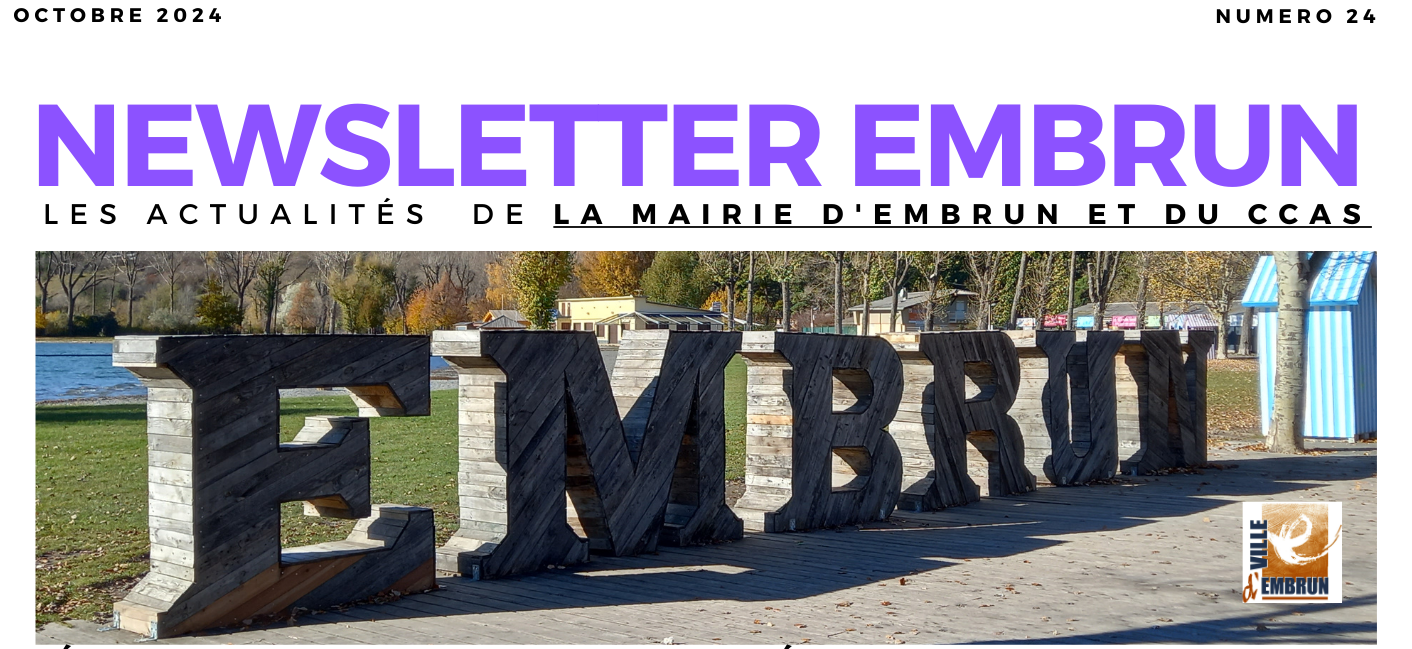Nous vous invitons à retrouver les actualités de la ville d'Embrun et de son CCAS dans la nouvelle Newsletter du mois d'Octobre 2024 en cliquant sur le bouton ci-dessous :