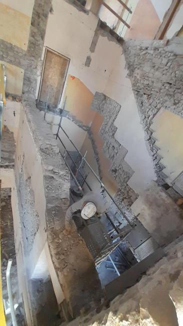 Le mois de janvier a été essentiellement consacré à ces prestations, puis viendront début février les travaux de toiture (consolidation de la charpente) ainsi que de renforcement des fondations sous les murs porteurs existants ainsi que sous les ouvrages nouveaux (ascenseur et escaliers).