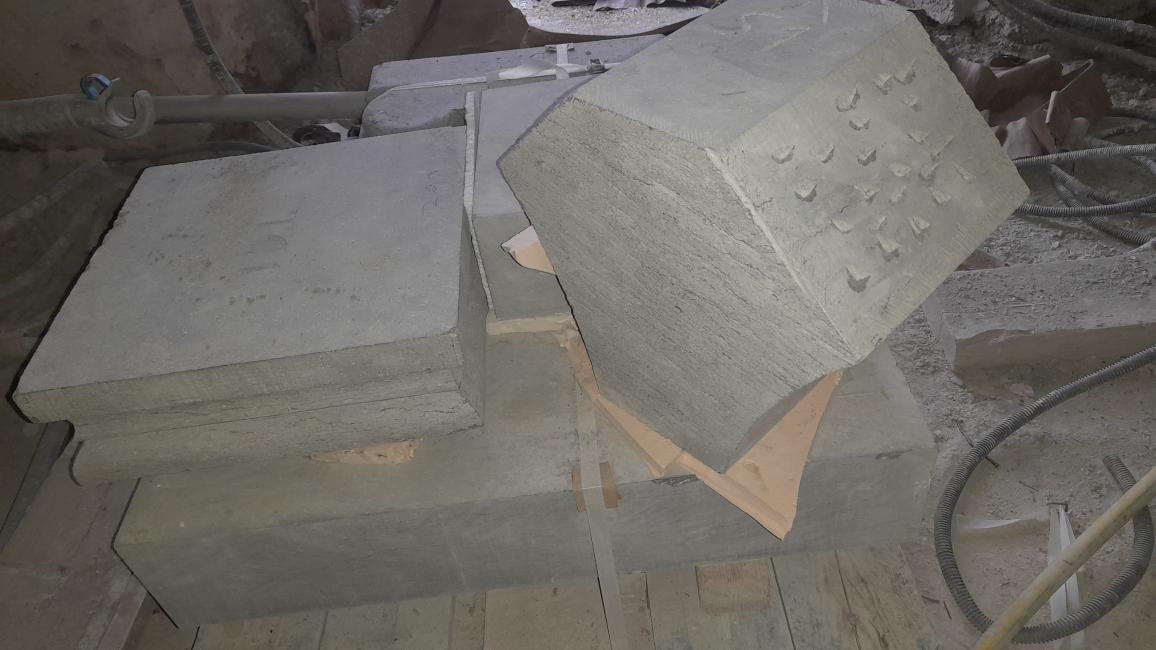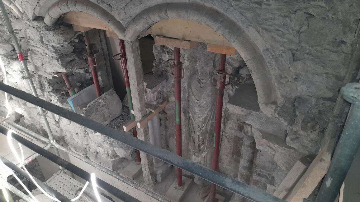 • Les ateliers Bouviers ont apporté les premières pierres devant permettre de restaurer les baies géminées. Une fois la 1ère baie reprise la DRAC validera le choix des pierres pour permettre de poursuivre au reste de l’édifice