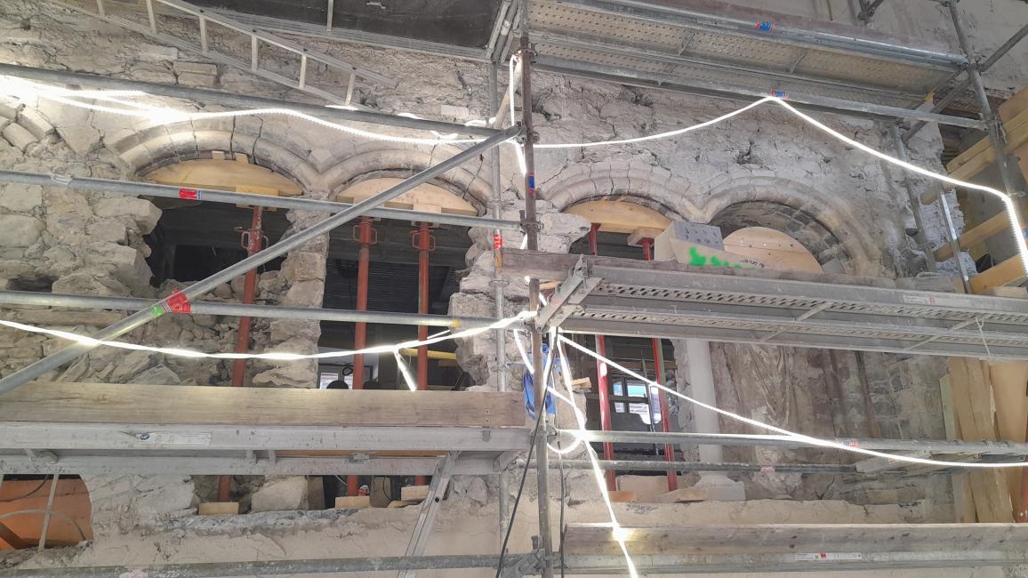- L’échafaudage a également été monté au niveau du mur médiéval pour permettre dans les semaines à venir la restauration des baies géminées.
