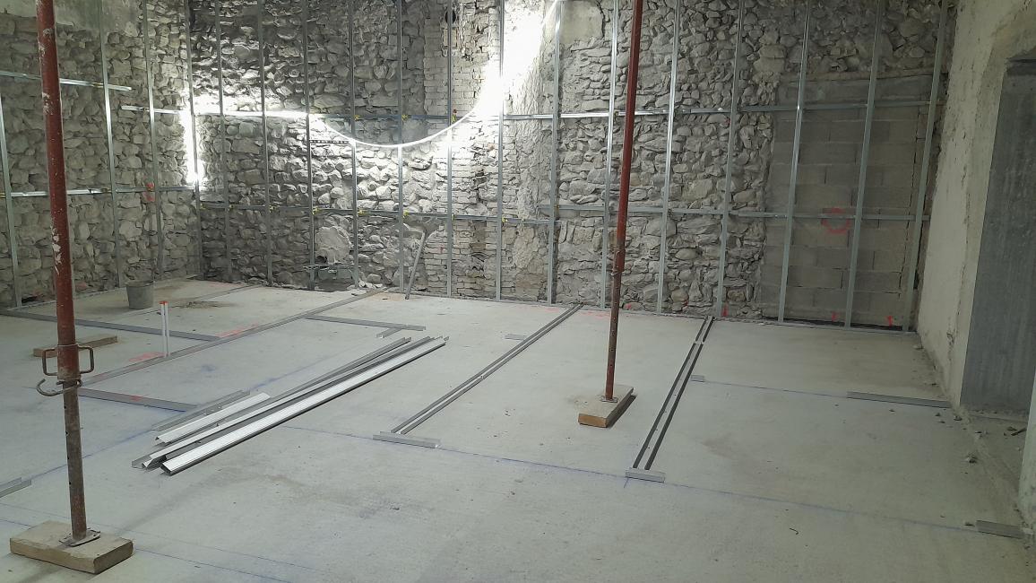 - Au rez-de-chaussée, les travaux de création des gradins se poursuivent en parallèle de la création de l’escalier encloisonné