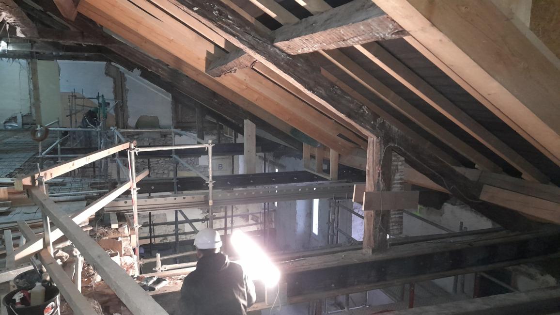 - Le mois de janvier a été essentiellement consacré à ces prestations, puis viendront début février les travaux de toiture (consolidation de la charpente) ainsi que de renforcement des fondations sous les murs porteurs existants ainsi que sous les ouvrages nouveaux (ascenseur et escaliers).