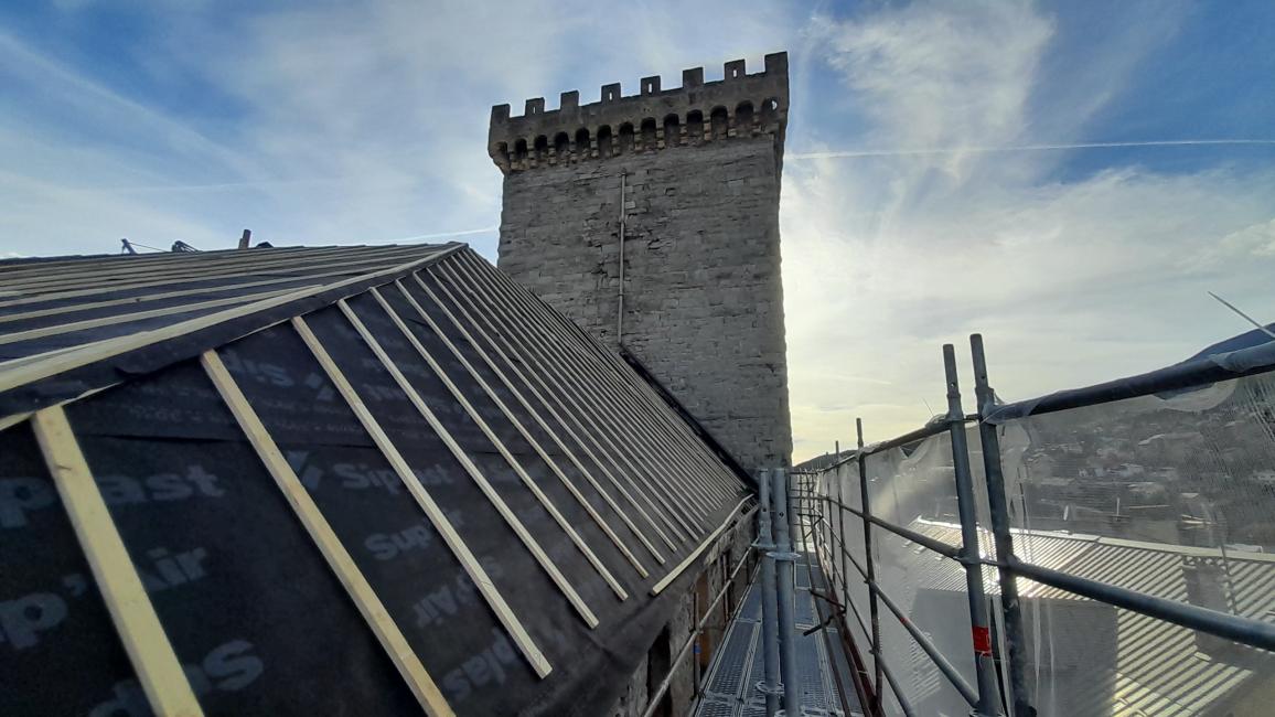 - Les charpentiers renforcent la charpente et ont commencé à déployer le pare pluie côté Tour Brune