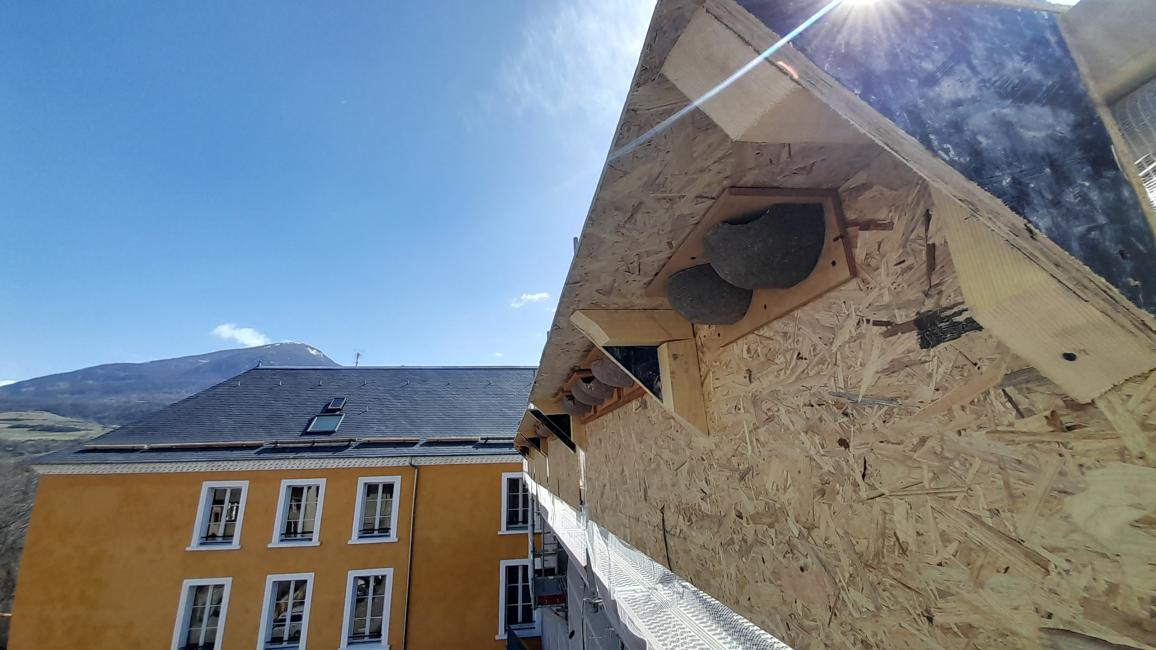 - L’entreprise des Compagnons de Castellane a mis en place les nids artificiels (40 nids doubles) à destination des hirondelles des fenêtres pour compenser le temps des travaux la destruction des quelques nids qui étaient présents. Pour mémoire, ces interventions s’effectuent sous le contrôle d’un bureau d’étude spécialisé qui fait au fil des travaux un retour écrit à la DREAL PACA.