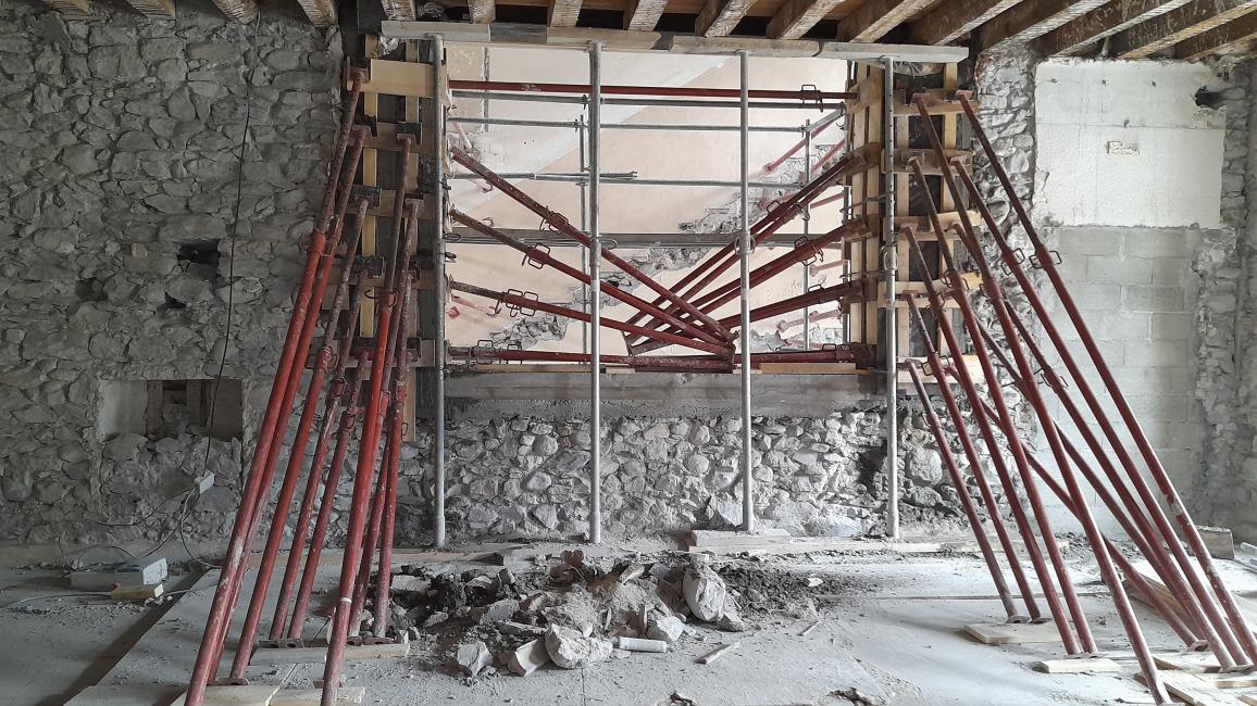 - L’entreprise des Compagnons de Castellane a finalisé le renforcement du sommet de la façade ouest avec la clôture d’un chaînage et prépare actuellement le chaînage de la façade Est. Elle a également commencé les reprises en sous œuvre du rez-de-chaussée en lieu et place des futures ouvertures