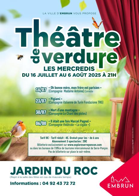 Comme les années précédentes, les représentations se dérouleront en extérieur au Jardin du Roc les mercredis à 21h (avec repli à la salle des fêtes en cas de mauvais temps) avec des compagnies professionnelles. Comédie, hommage à Pagnol, théâtre visuel venu de Turin ou encore immersion dans une pièce dont l'histoire se déroule en montagne.