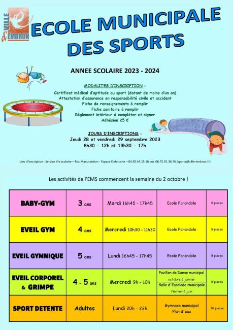 L’école des sports de la commune d’Embrun est gérée par le service Vie Scolaire. Elle accueille les enfants de 3 à 6 ans et les adultes. Elle se divise en deux parties : les activités pour les enfants et celle pour les adultes.