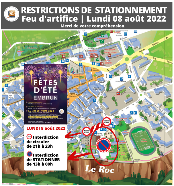 Le ville d'Embrun vous informe de restrictions de circulation et de stationnement au niveau de l'Espace Delaroche le lundi 08 août pour le bon déroulement du feu d'artifice des Fêtes d'été d'Embrun:
