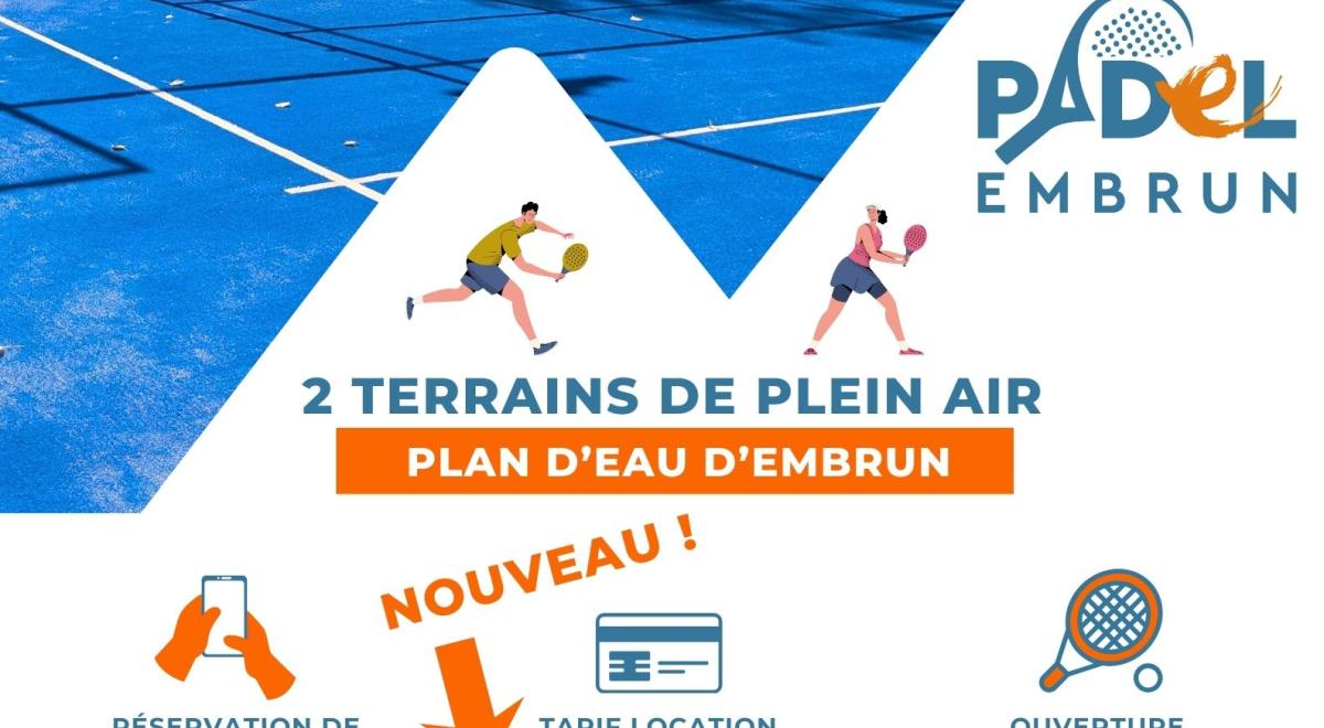 Inaugurés officiellement le 21 juillet en présence de Renaud MUSELIER, Président de la Région Provence-Alpes-Côte d’Azur, Président délégué de Régions de France et Dominique DUFOUR, Préfet des Hautes-Alpes, Chantal EYMEOUD, maire d’Embrun vous informe de la mise en fonctionnement des terrains de PADEL au plan d’eau d’Embrun.